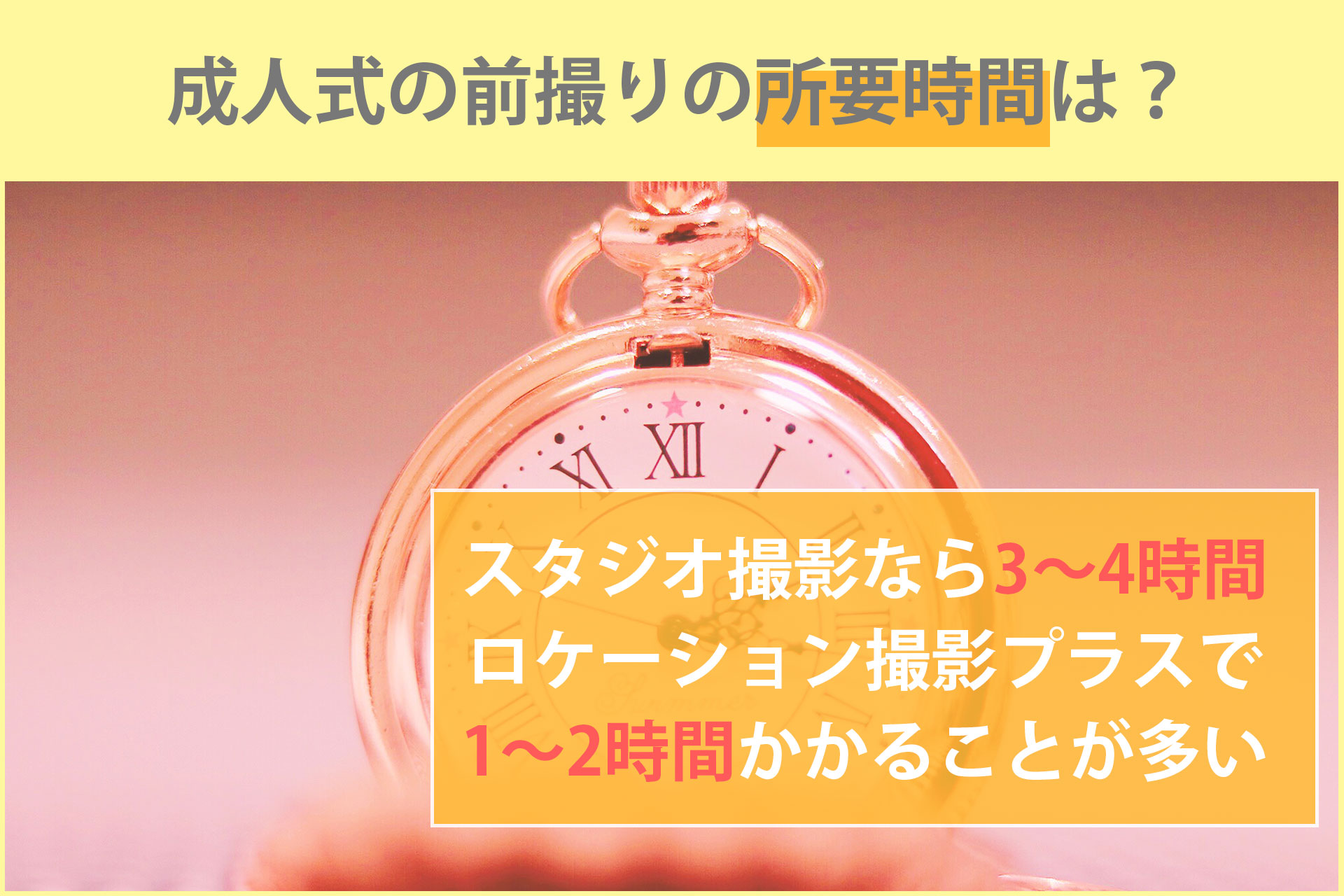 - 成人式の前撮りの所要時間はスタジオ撮影なら3~4時間ロケーション撮影の場合は5時間近く