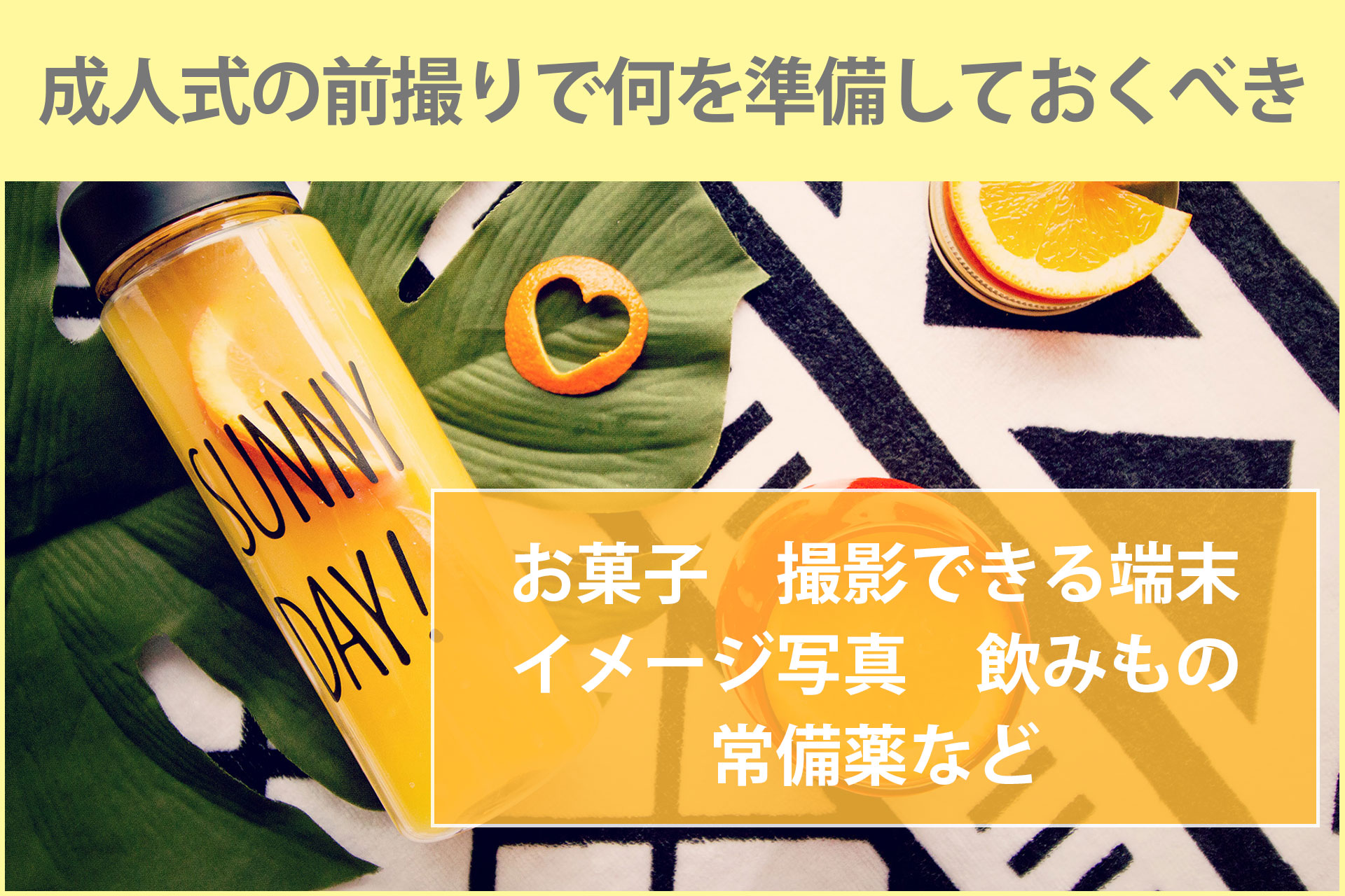 - 成人式の前撮りでは小腹用の軽いお菓子や飲み物、撮影できる端末や常備薬などを準備