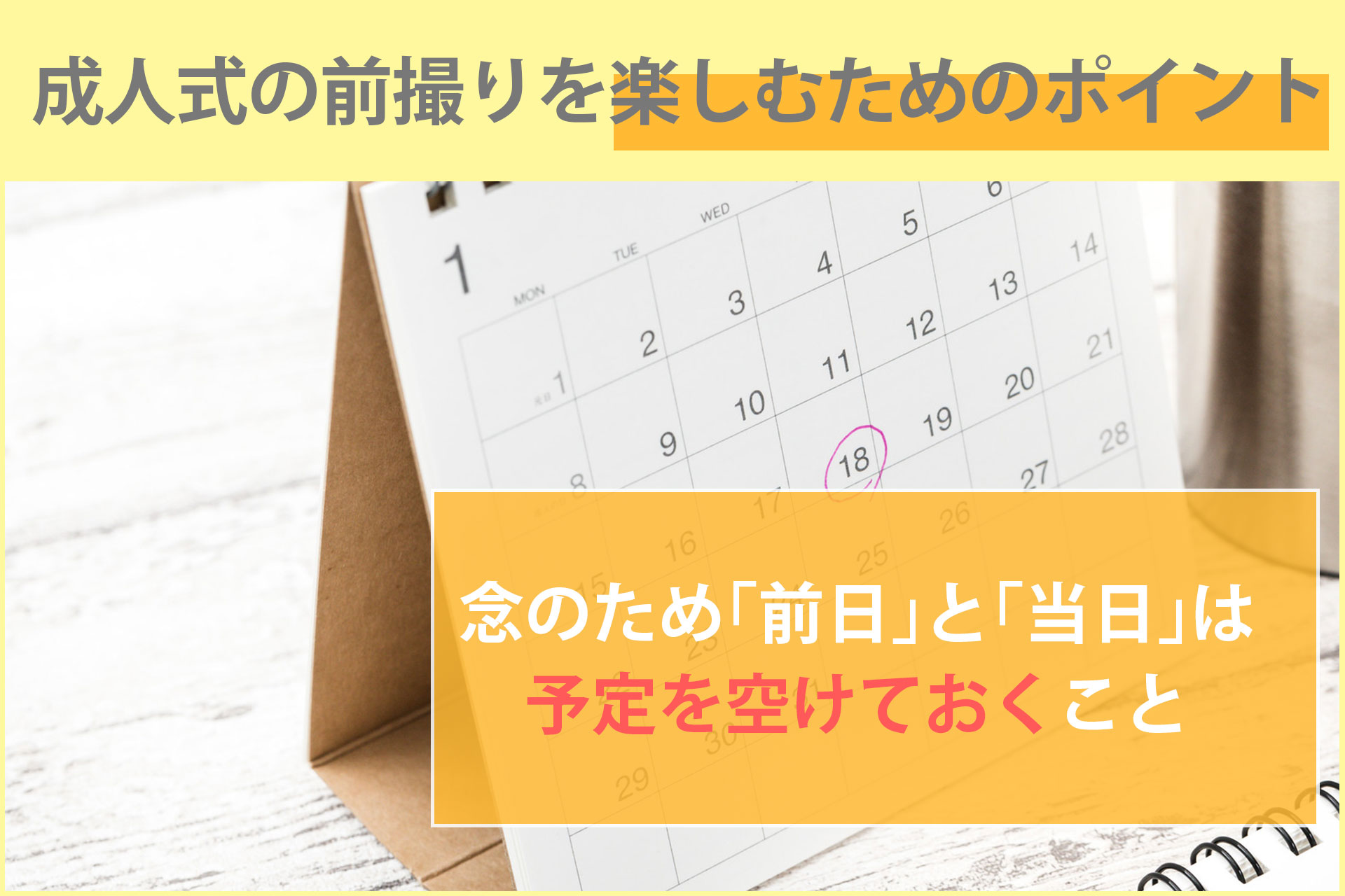 成人式の前撮りを楽しむためにも、「前日」と「当日」は予定を空けておくことをおすすめします。