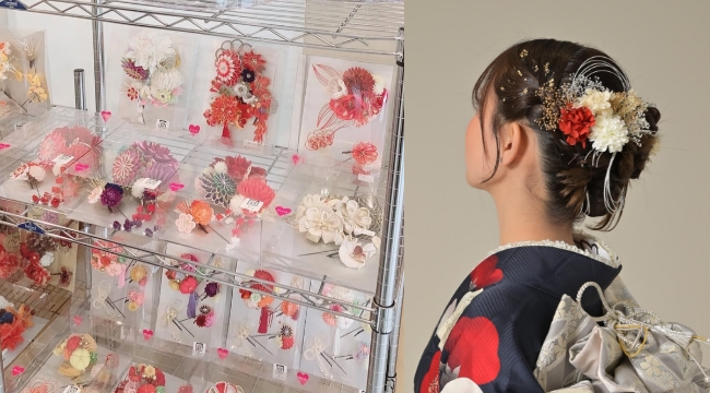 振袖をお選びいただいたあとに、小物のコーディネートとヘアセットのご相談を承ります。小物をひとつひとつセレクトしながら、専門のスタイリストにヘアセットを相談しながら、あなただけの素敵な振袖スタイルが完成します。
